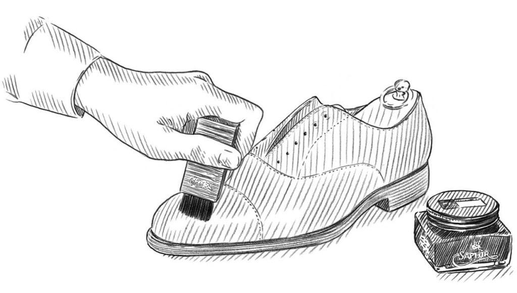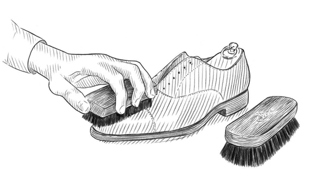 ก่อนที่จะเริ่มขบวนการนี้ ควรปัดและแปรงรองเท้าของคุณด้วยแปรงขนม้า Horsehair Brush ให้ฝุ่นและความสกปรกเบื้องออกจากรองเท้าก่อนทุกครั้ง ขั้นตอนนี้สำคัญโดยที่เราไม่ใช้ผลิตภัณฑ์ดูแลให้ปนกับสิ่งสกปรกบนรองเท้าหนังของคุณ