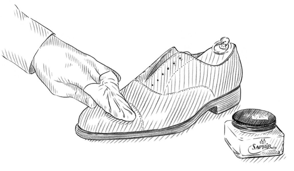 ในขั้นตอนสุดท้ายสำหรับการดูแลรองเท้า เราจะแนะนำให้ทำการลง Shoe Cream ด้วย Saphir MDO 1925 Creme เป็นผลิตภัณฑ์ที่เป็นฉพาะในฝื้นฟูหนัง เช่นการเติมสี บำรุง และ ป้องกัน เนื่องจากตัวครีมมีส่วนผสมของ Beeswax สารตัวทำละลาย (เช่น Turpentine) และ Shea Butter