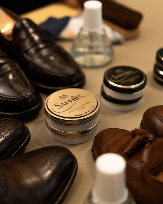ในการสอนวิธีขัดในงานนี้ จะเน้นใช้ผลิตภันณ์ Saphir Médaille d’Or อยู่สองตัว คือ Saphir MDO Pate de Luxe กับ Saphir MDO Mirror Gloss ในการขัดเงาแบบ Mirror Shine จำเป็นต้องสร้างชั้นฐาน Base ของแว็กซ์ที่ค่อนข้างหน้า ตัว Saphir MDO Pate de Luxe จึงเป็นผลิตภันณ์ที่เหมาะอย่างยิ่งกับกระบวนการนี้ สำหรับ Saphir MDO Mirror Gloss นั้นได้นำมาใช้เป็นชั้นสุดท้ายในการ Finishing ให้ขึ้นเงาเป็นพิเศษ