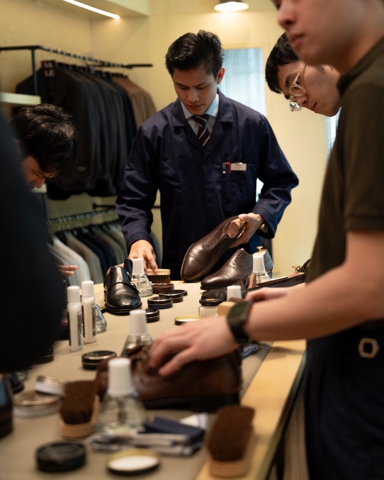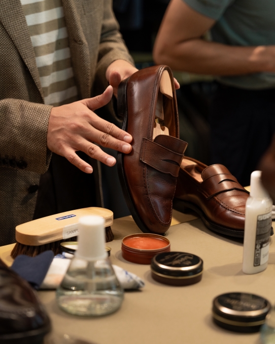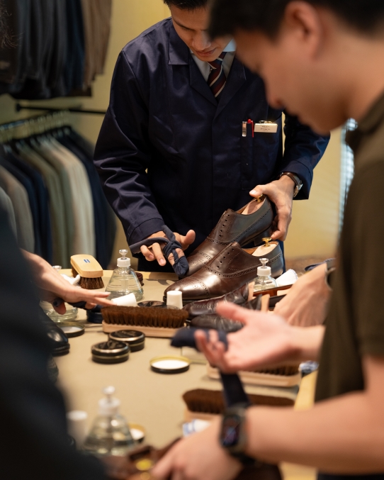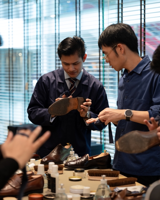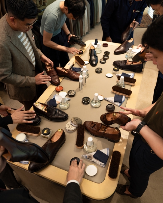 ด้วยหัวข้อ “Mirror Shine Workshop by Saphir with Resh Thailand” ทางผู้ร่วมกิจกรรมได้นำรองเท้าของตัวเองมา โดยมีการบำรุงมาแล้วเบื้องต้น ในการขัด Mirror Shine หากไม่เคยชิน หรือ ทำครั้งแรก อาจใช้เวลานานพอสมควร การบำรุงขั้นต้นพื้นฐานมาแล้วสามารถทำให้ขัดเงาได้ง่ายขึ้นและมีประสิทธิภาพมาก ในการขัดเงารอบนี้ มีทั้งรองเท้าที่เป็นหนังเรียบ Calfskin หนัง Grain และ หนัง Shell Cordovan อีกเช่นกัน