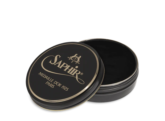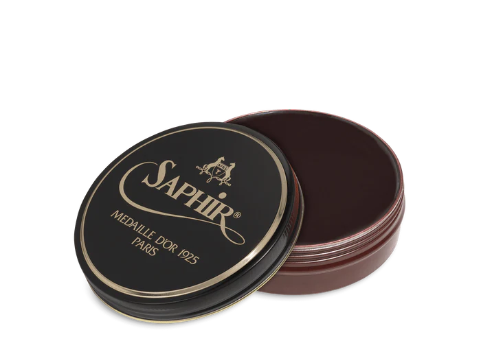 Our famous Saphir Pâte De Luxe wax polish combines a selection of premium oils and waxes, including turpentine spirit (natural pine extract), beeswax, carnauba wax, and six other waxes with nourishing, protecting, softening and shining qualities.