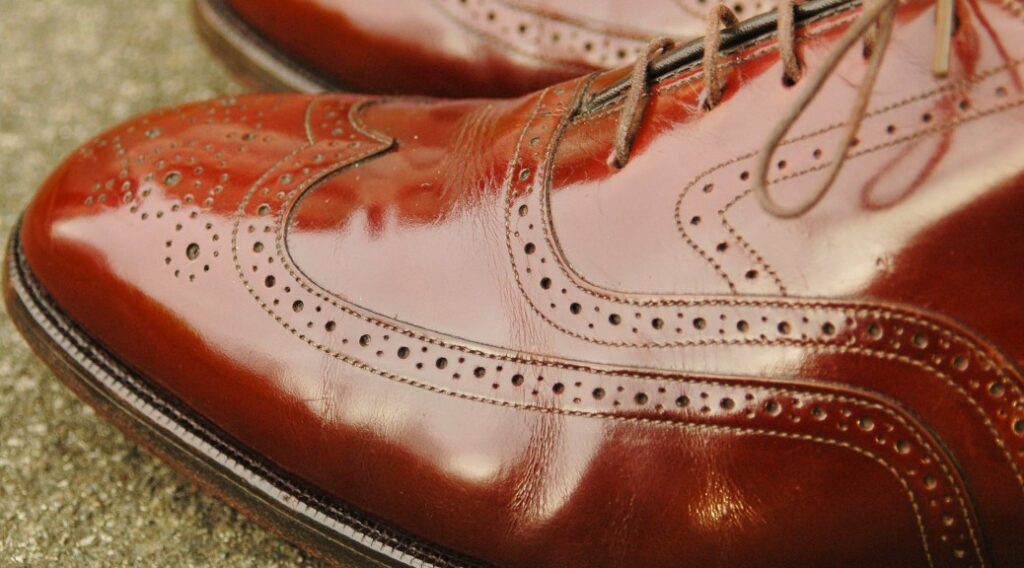 Aniline Leather – หนังชนิดนี้ หลายๆท่านอาจจะคุณเคยกับหนังเช่น Box Calf หรือ Museum Calf นั้นเอง โดยหนังชนิดนี้ จะมีการย้อมสีแบบลึกเข้าไปในชั้นหนัง ผ่านการย้อมสีด้วยการ Drum Dyeing โดยหนังที่ออกมาจะดูมีความเท่าเทียมเสมอกันทั้งพื้น เป็น uniform look จะสามารถหาได้ในรองเท้าสี Black หรือ Dark Brown สะส่วนใหญ่